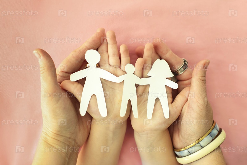 Родители и ребенок держат в руках семейную бумагу. Празднование Международного дня семьи