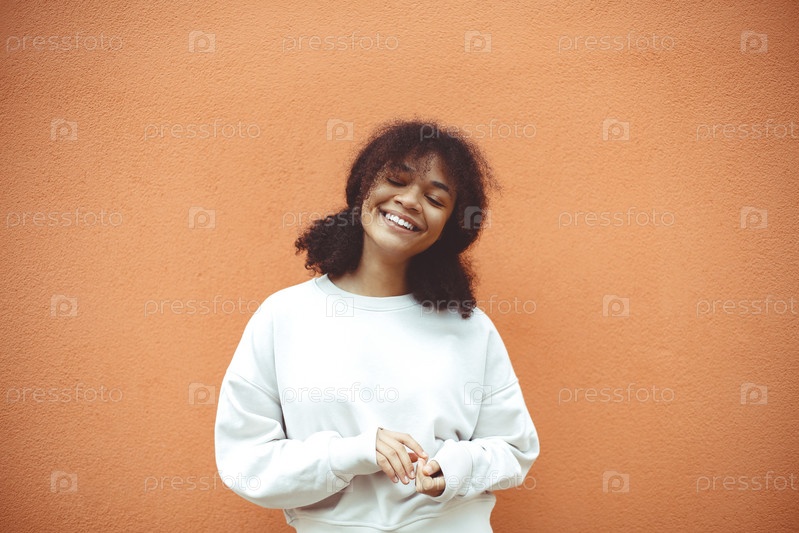 Настоящее счастье. Счастливая кудрявая африканская американка с закрытыми глазами у оранжевой стены