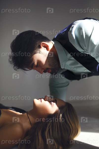 Стильная молодая этническая пара, обнимающаяся на фоне темно-серой стены и смотрящая друг на друга