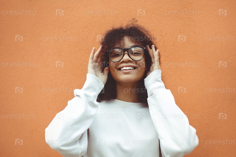 Счастливая позитивная молодая афроамериканка, позирующая в стильных очках, улыбающаяся афро-девушка в очках