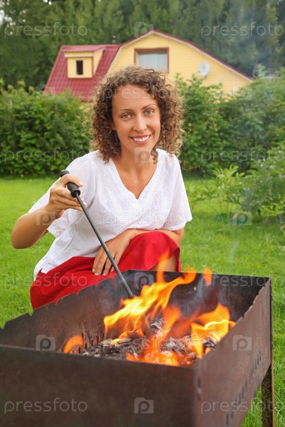 Молодая женщина возле мангала на пикнике