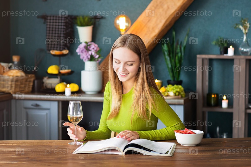 Молодая женщина читает интересный журнал за деревянным столом