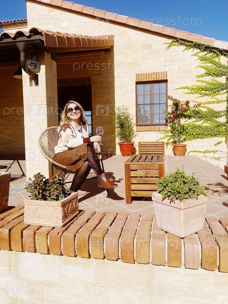 Блондинка пьет белое вино на закате в солнечных очках