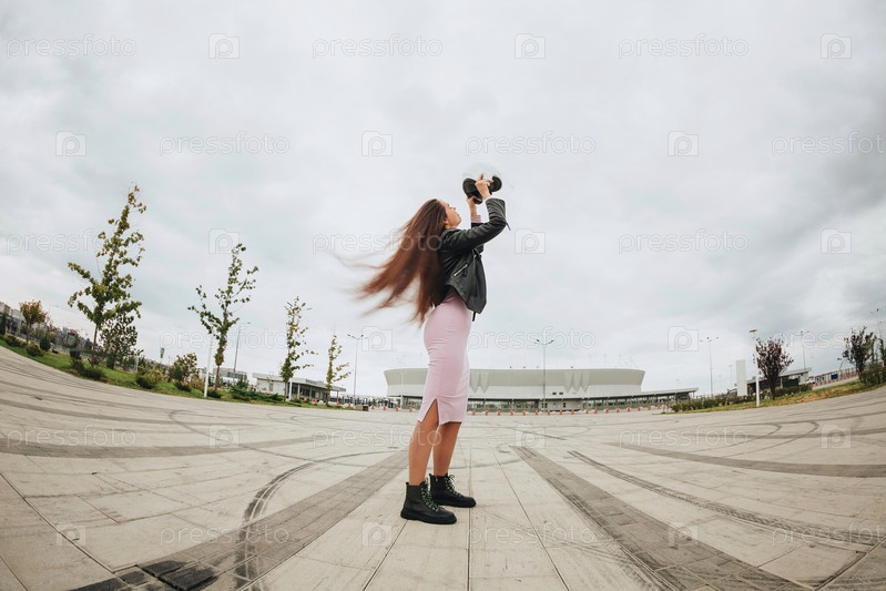 Молодая привлекательная женщина-байкер в велосипедном защитном шлеме, стоя на пустом стадионе на открытом воздухе