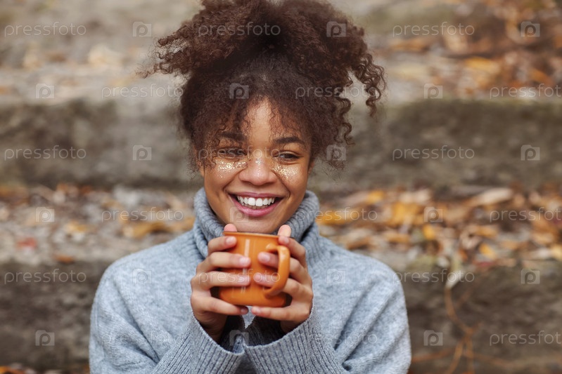 Веселая молодая чернокожая женщина с блестящим блестящим макияжем сидит снаружи с чашкой чая