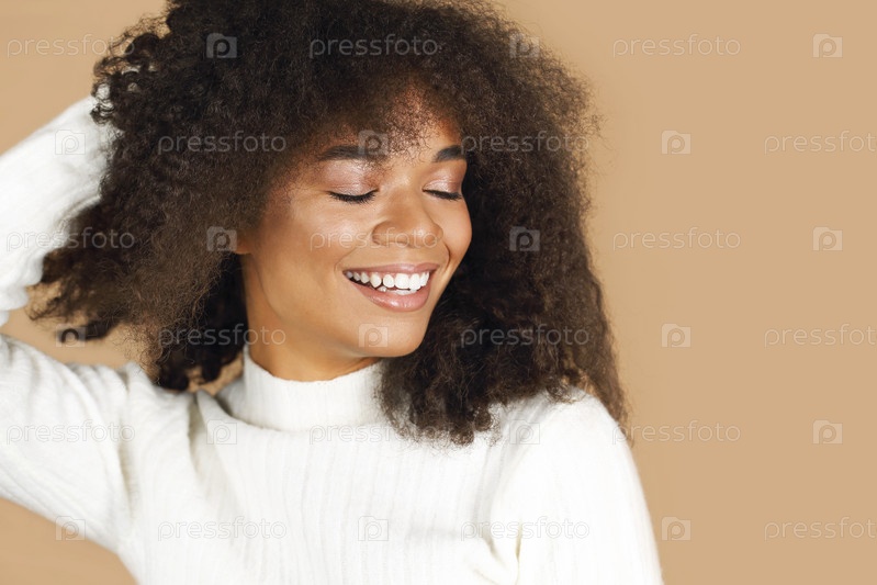 Студийный снимок великолепной веселой африканской молодой женщины с вьющимися волосами, улыбающейся