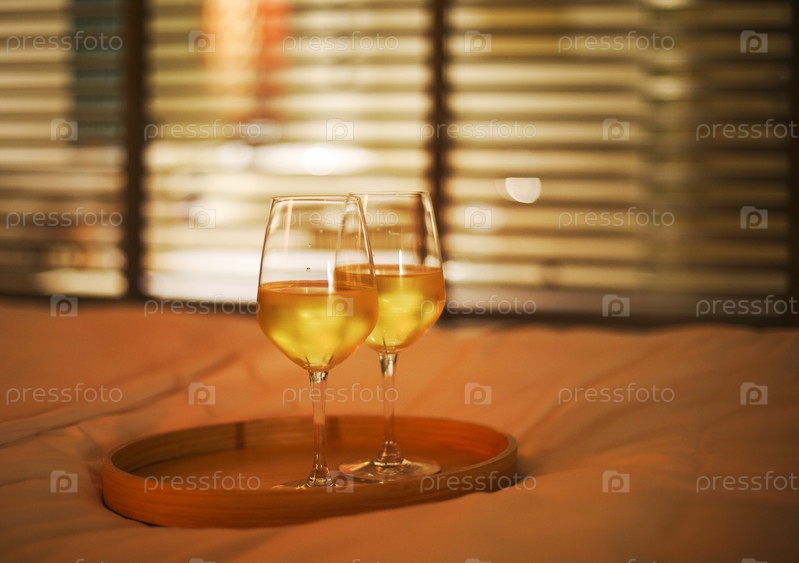 Два бокала белого вина в постели на размытом фоне