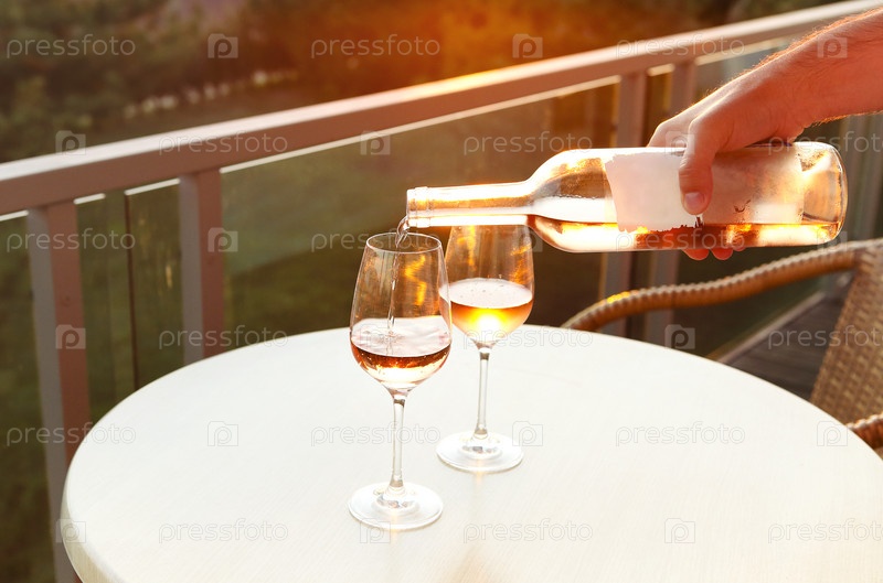 Два бокала и бутылка розового вина вечером на террасе