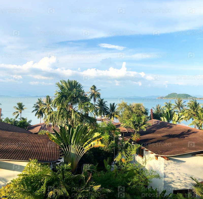 Вид с воздуха на красные крыши домов, пальмы и океан. Тропический пейзаж на острове
