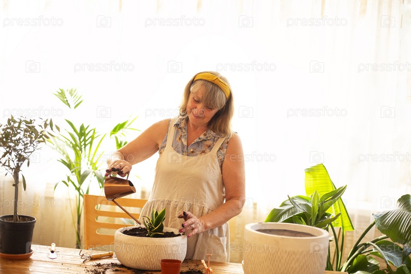 Улыбающаяся кавказская пожилая женщина в фартуке работает в домашнем саду, поливает комнатное растение после пересадки