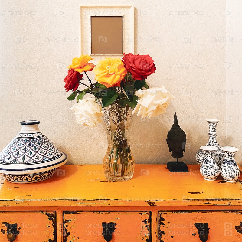 Букет свежих разноцветных розовых цветов в стеклянной вазе на желтом винтажном столе с головой будды