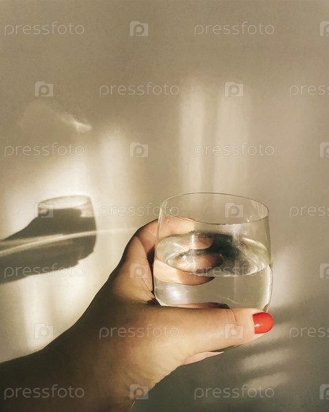 Женская рука держит стакан чистой минеральной воды у бежевой стены с тенью