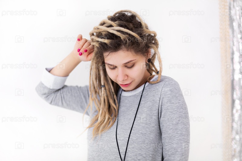 Счастливая женщина трясет дредами и улыбается