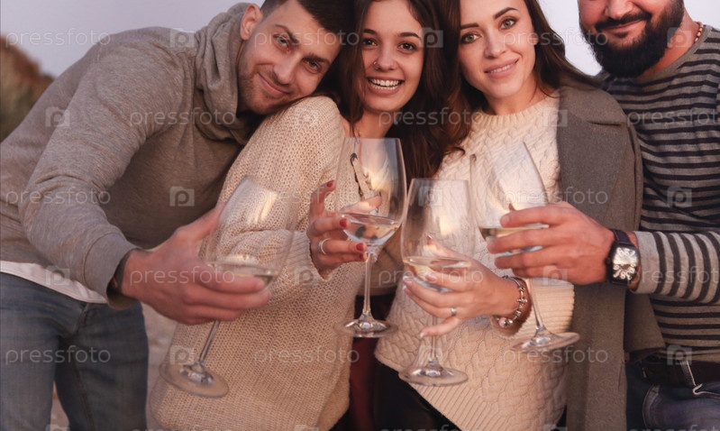 Счастливые друзья вместе празднуют особое событие на пляже в выходные
