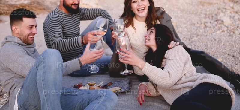 Счастливые друзья вместе празднуют особое событие на пляже в выходные
