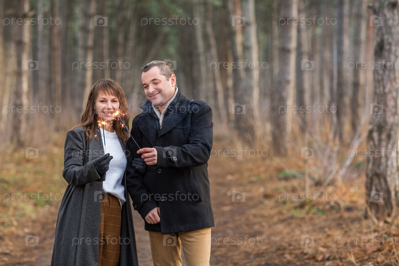 Счастливая пара обнимается и целуется в зимнем парке
