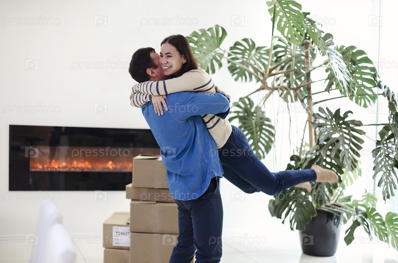 Счастливая пара с картонными коробками обнимается в новом доме