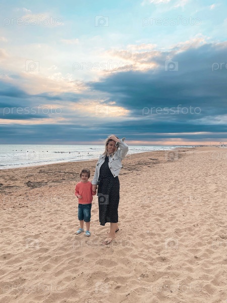 Молодая любящая мать с улыбающейся дочерью, гуляющая со своей маленькой дочерью на солнечном пляже