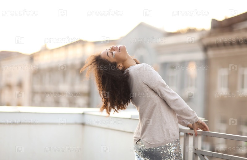 Молодая счастливая африканская американка с блестками на лице наслаждается видом на закатный город на крыше