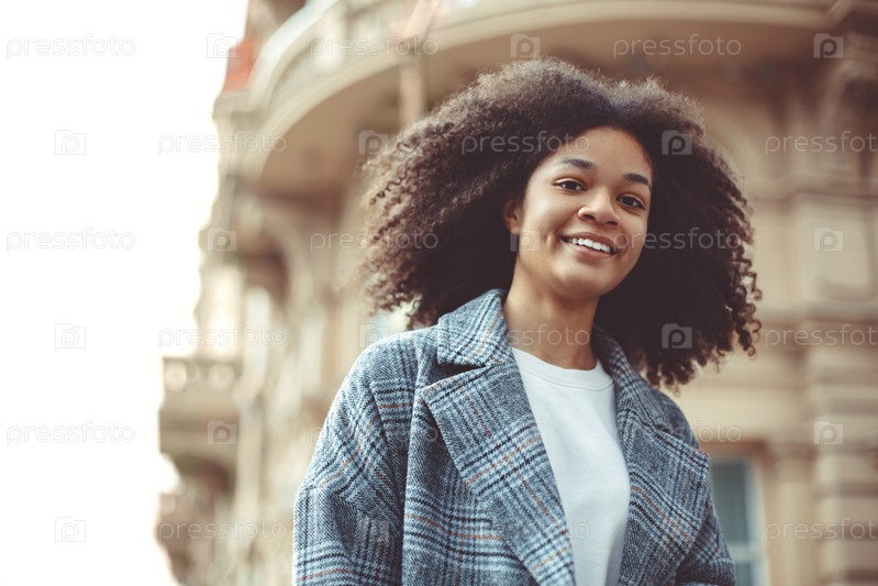 Молодая стильная позитивная афроамериканка, пересекающая зебру и улыбающаяся в камеру во время прогулки по городу