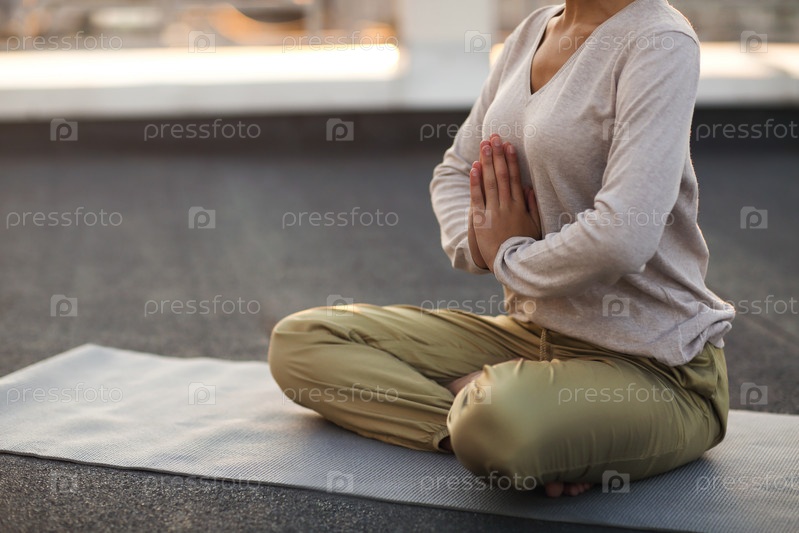 Женщина сидит в позе лотоса на коврике и занимается йогой, женщина медитирует на открытом воздухе