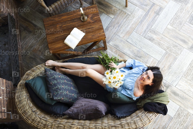 Женщина с цветами отдыхает на диване
