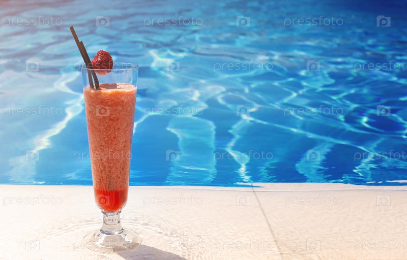 Стакан с ярко-красным коктейлем на столе у бассейна с копией пространства