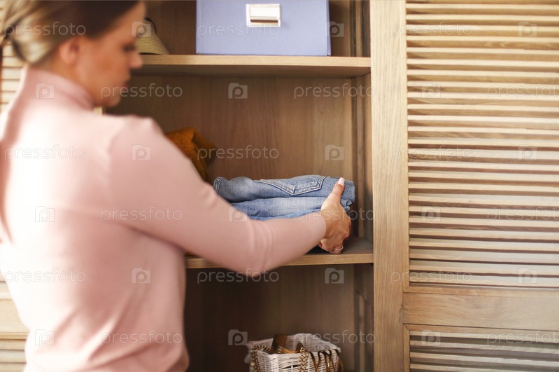 Весенняя уборка шкафа. Молодая женщина у хранилища в стиле ретро