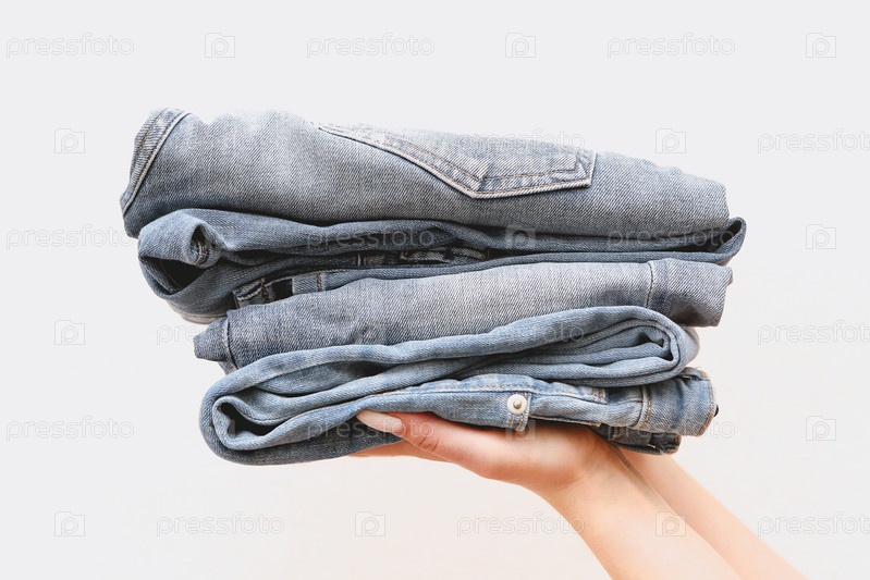 Молодая женщина-продавец держит в руках кучу джинсов на светлом фоне