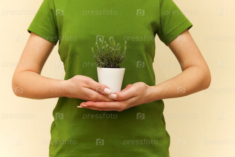 Женские руки с маленьким кактусом, выборочный фокус