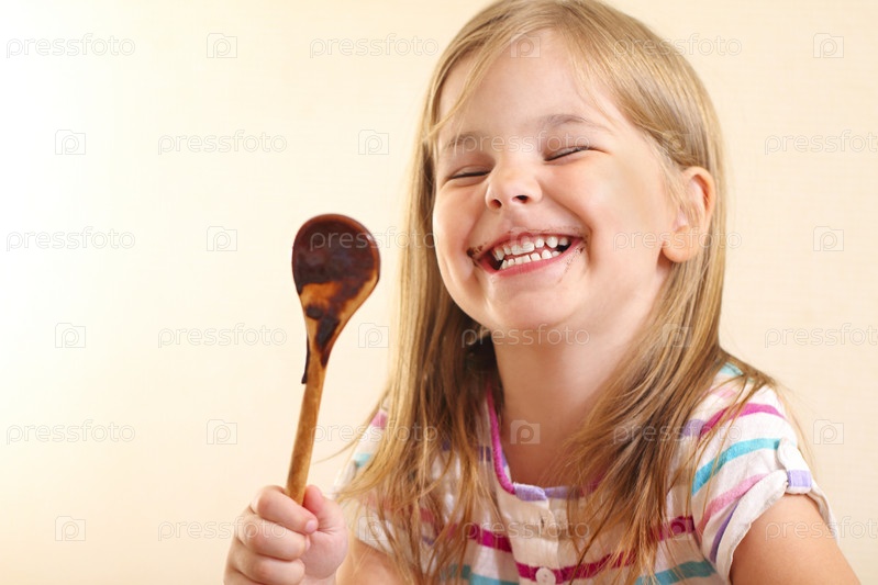 Веселая девушка ест шоколадный соус