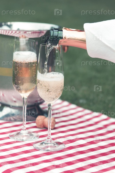 Шампанское разливают на летнем пикнике