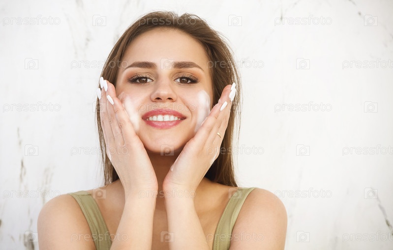 Красивая молодая кавказская женщина моет лицо пеной