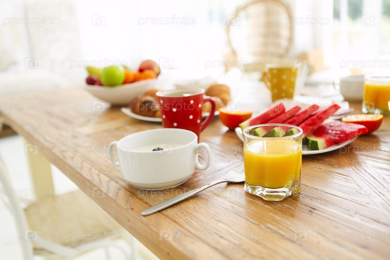 Кофе с фруктами, хлопьями и круассаном на фоне деревянного стола