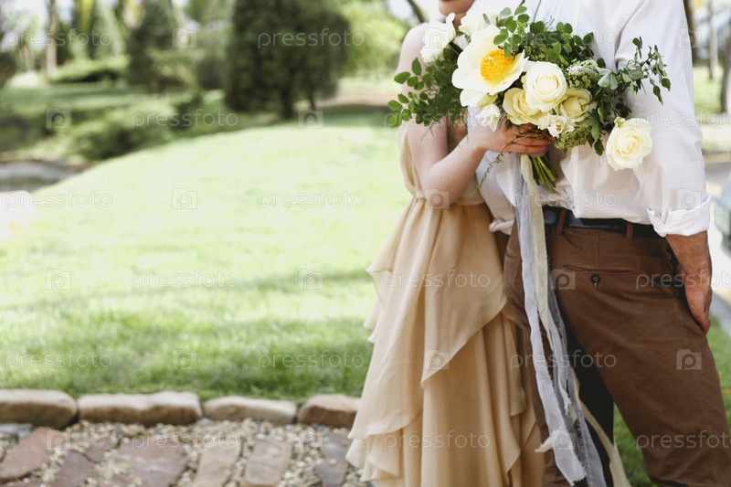 Невеста с удивительным букетом свежих нежных цветков и объятием жениха