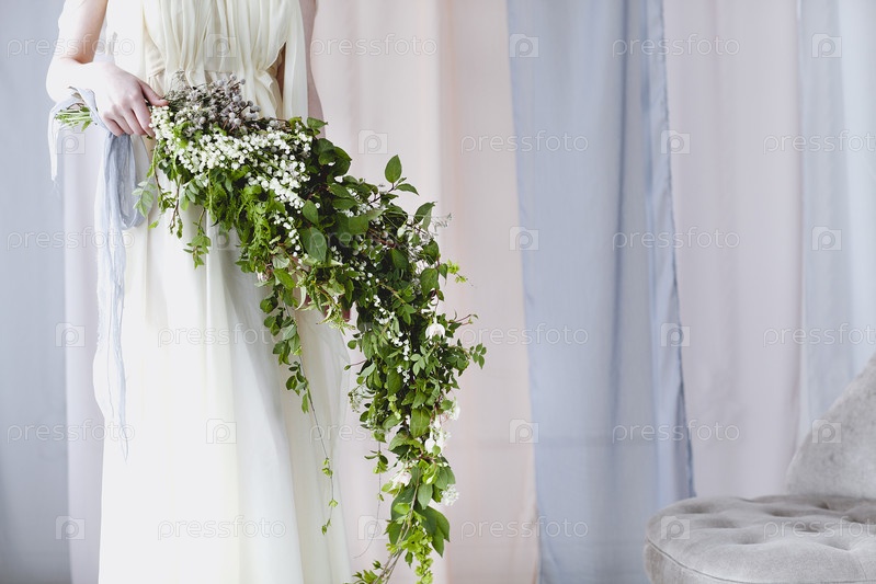 Невеста в нежном платье с необычным букетом из маленьких белых цветов
