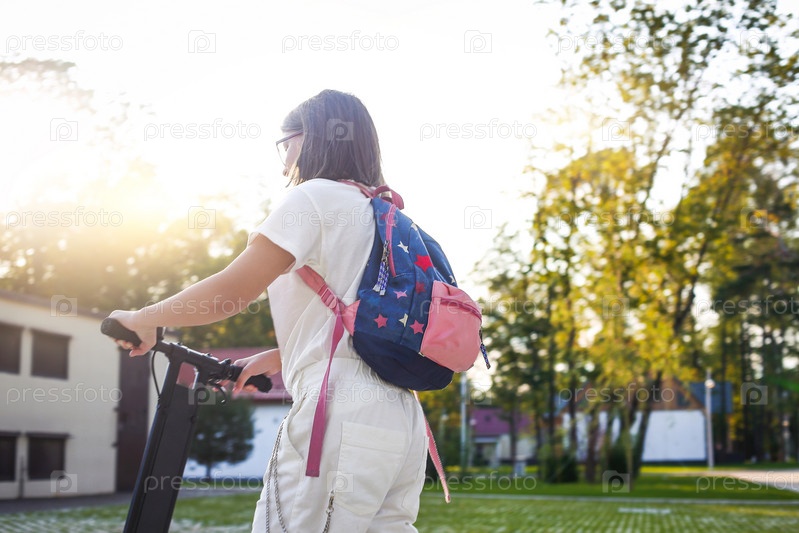 Молодая студентка в очках катается на синем электрическом самокате в парке