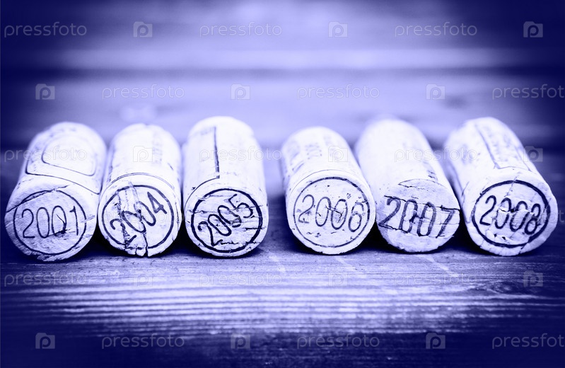 Датированные пробки от винных бутылок на деревянном фоне