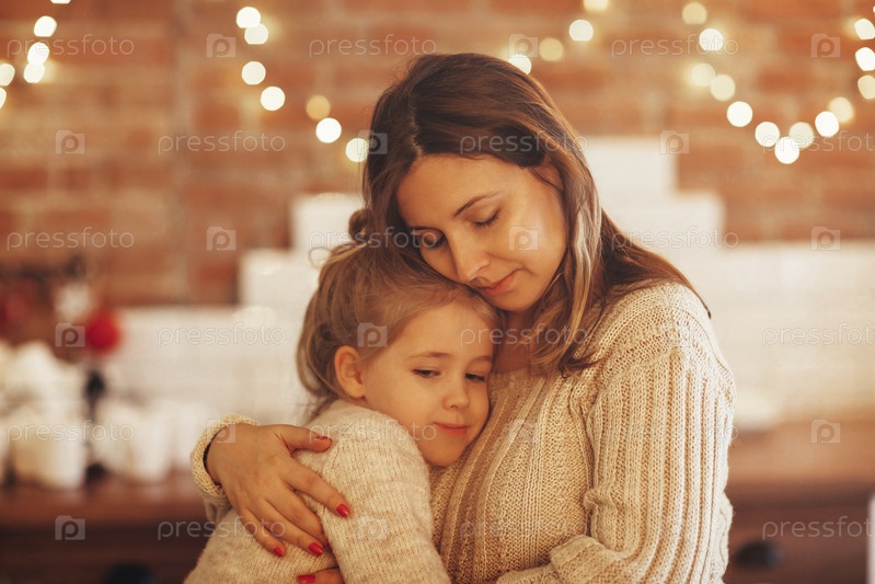 Мать и маленькая дочь обнимаются, сидя в комнате, украшенной к рождественским праздникам