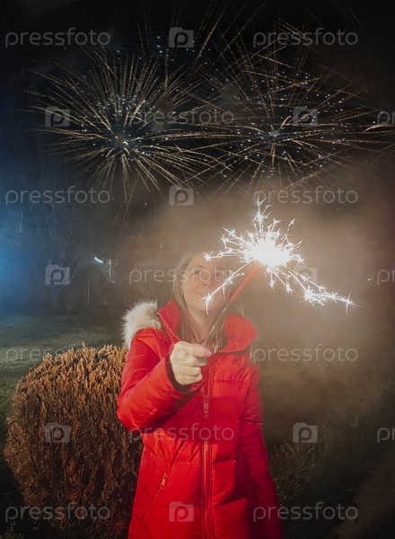 Счастливая девушка держит бенгальский огонь во время празднования Нового года на открытом воздухе в сумерках