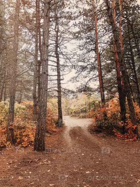 Пейзажное фото в стиле сепия хмурого осеннего дня в туманном хмуром лесу с голыми деревьями