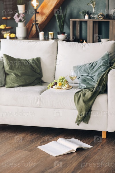 Фрукты и вино на диване дома