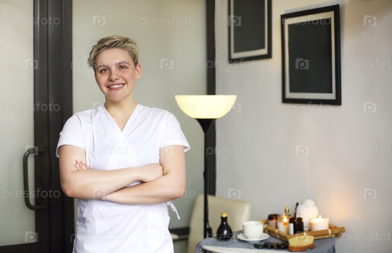 Улыбающаяся массажистка, стоящая в спа-салоне