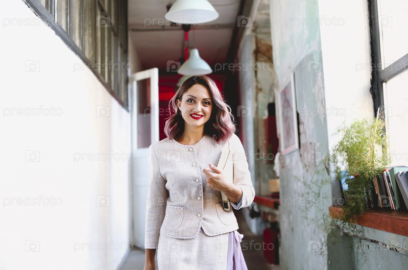 Стильная женщина с книгой смотрит в камеру