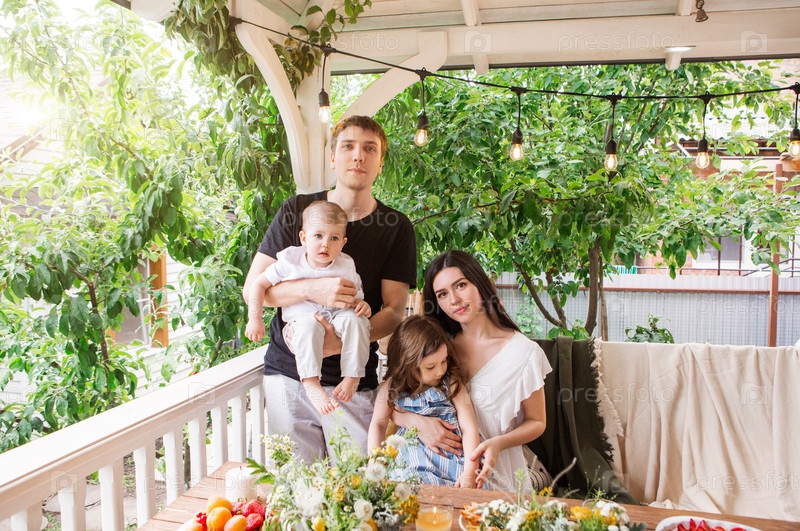 Счастливая семья за столом на террасе