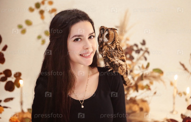 Женщина в костюме ведьмы держит сову