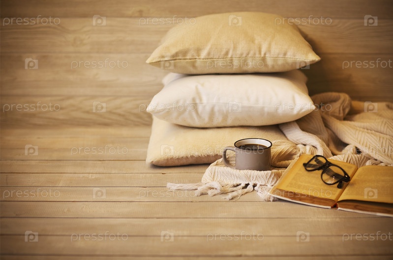 Чашка вкусного кофе и стаканы на книге в композиции с пледом и подушками