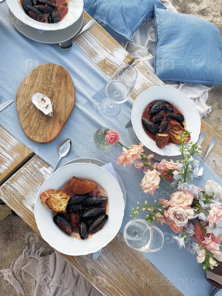 Пляжный летний стол для пикника со средиземноморскими мидиями из морепродуктов, устрицами и бокалами белого вина