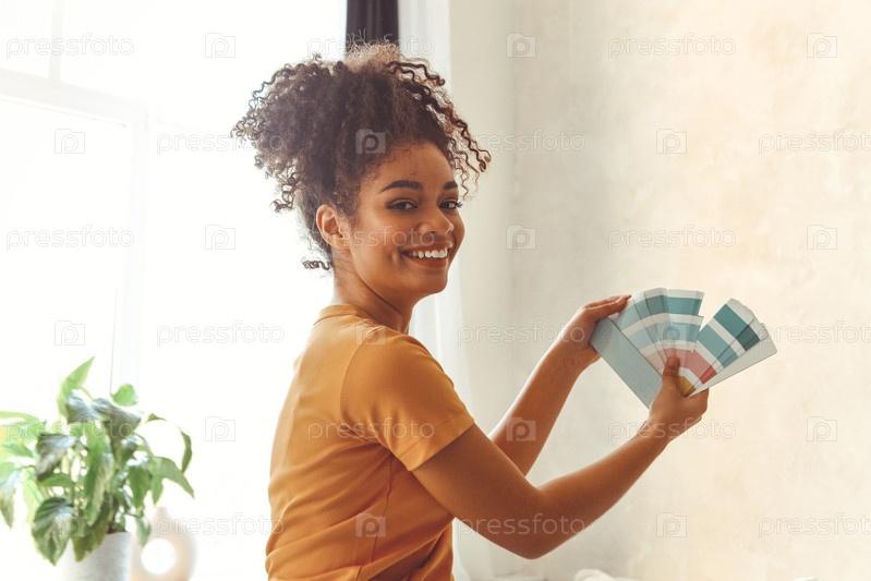 Улыбающаяся афроамериканка стоит спиной к камере посреди спальни с палитрой синих оттенков для ремонта интерьера