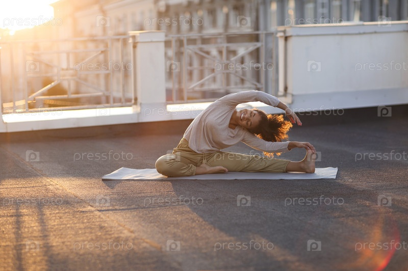Молодая спортивная счастливая женщина смешанной расы в спортивной одежде делает упражнения на растяжку, сидя на коврике для йоги на крыше дома рано утром